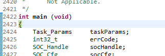After doing all of that, the debug stops on the first breakpoint (auto-established by CCS) on the first line of main(), as follows: