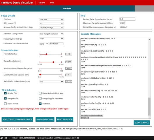 Now, the problem is that I face an error on sending the start command to the sensor with the default config (shown below).