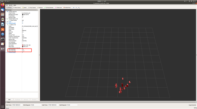 When using the ROS engine to generate a millimeter-wave point cloud, the information displayed by the point cloud includes x, y, z, intensity, and velocity.