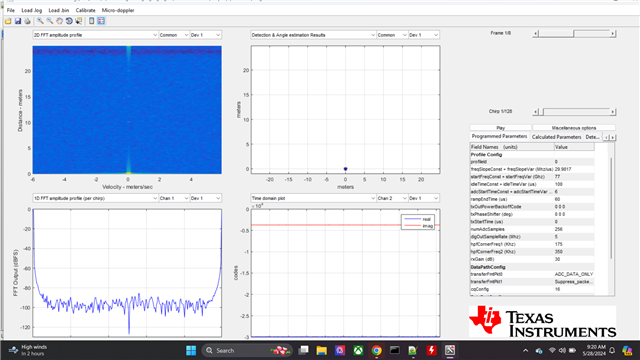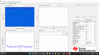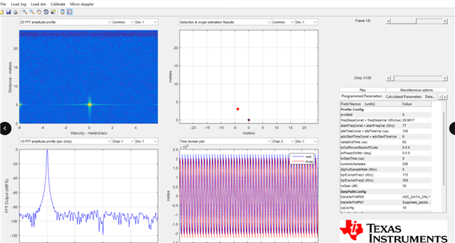 I'm using a Texas Instruments AWR1642BOOST with a DCA1000EVM. No matter where I run the DataCaptureDemo_xWR.lua script, the visualization from mmWave Studio always looks like the attached image (with the same one detection to the left of center in the top right plot). I tried running it in a garage, a open field, a park, in my office, pointing directly at a huge six tone truck. The image always looks the same. The adc_data.bin is slightly different at each capture. But the visualization always looks the same despite very different scenes. So, there are a few possibilities: