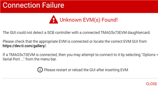I have been working with the TMAG5273 EVM for several days without any issues. However, today it suddenly only detects the SCB and not the TMAG5273. I suspect there may be an issue with a pin that is malfunctioning, as I have already updated the firmware and restarted the computer multiple times. I would like to know if there is anything I might be overlooking that could help resolve this issue.