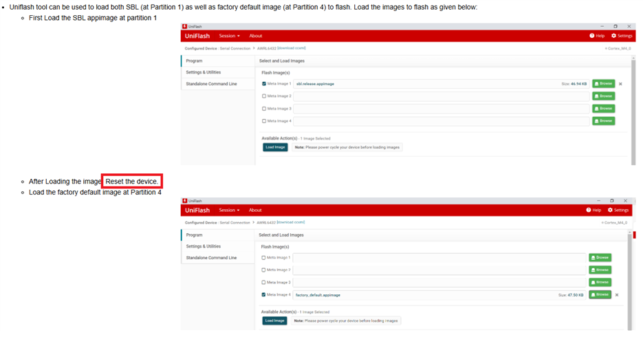 It mentions after programming SBL, you need to reset the device and then program the other image.