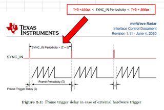 I believe that if the above is represented in a diagram, it would look like the figure below (T+δ +150us < SYNC_IN Periodicity < T+δ + 300us)
