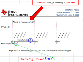 The document "mmWave Radar Interface Control Document Revision 1.11" states that the periodicity of pulse is configured to occur 150us after the completion of previous frame, and it is recommended that the time delta between end of previous frame and rising edge of HW pulse be < 300us.