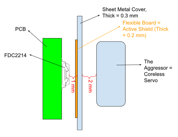 I've tried to implement this sensor (on main board) with active shield, I have covered the main board with a small board connected to the active shield, and beside the small board (active shield) I have another metal part with the distance 1 mm based on the small board, and the sensor still detected the metal part. It should not be detecting the metal part due to put the active shield, right? What's wrong with my setup? Any suggestions?