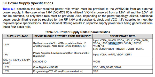 I'm working with AWR2944 Evaluation Board PROC113D .There are VIOIN connected to 3.3V and VIOIN_18 connected to 1.8V .It's not clear to me which signals in the AWR2944 are using the 3,3V on the VIOIN and which signals are using 1.8V on VIOIN_18 .Can any one help in this?.