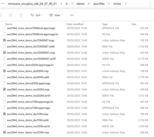 - The documentation states: "This will create <mmwave_sdk_device>_mmw_demo_mss.xer5f, <mmwave_sdk_device>_mmw_demo_dss.xe66 & <mmwave_sdk_device>_mmw_demo.appimage binaries", however gmake all created a multitude of files (see Image). I am curious why so many files were created? Is this typical only for the demo code to create TDM, DDM and other version of the 'same' demo code?