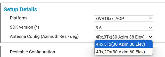 I am currently using the evaluation board AWR1843AOPEVM and have flashed it with the xwr18xx_mmw_aop_demo.bin firmware. I configured the device using the mmWave Demo Visualizer.