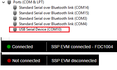 The Hardware dongle keeps disconnecting and reconnecting every few seconds as evidenced by the SSP EVM Connected - FDC1004 / SSP EVM Disconnected messages in the window footer.