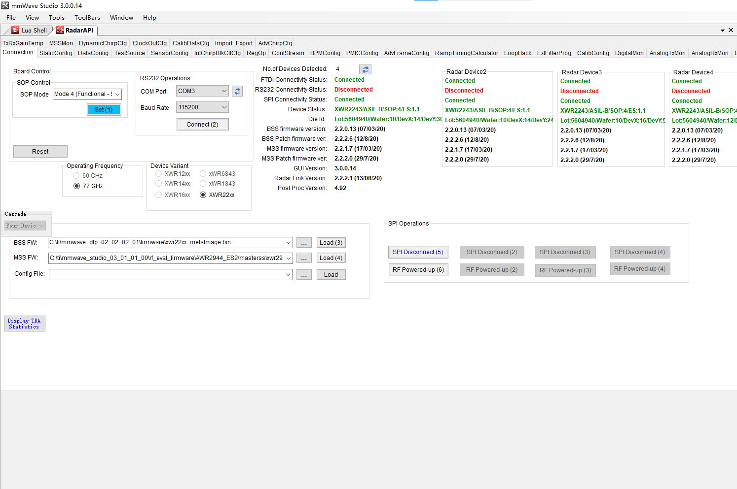 GM: Constructor GM: Wed Jul 23 18:34:44 2025 RSTD.Transmit("/Settings") [18:34:44] [18:34:44] ### Running Startup script: "C:\ti\mmwave_studio_03_00_00_14\mmWaveStudio\Scripts\Startup.lua" ### [18:34:44] RSTD.SetAndTransmit ("/Settings/Scripter/Display DateTime" , "1") [18:34:44] RSTD.SetAndTransmit ("/Settings/Scripter/DateTime Format" , "HH:mm:ss") [18:34:44] Scripter ignored: Attempt to UnBuild() again or before Build. [18:34:44] RSTD.SetVar ("/Settings/Clients/Client 0/Dll" , "C:\\ti\\mmwave_studio_03_00_00_14\\mmWaveStudio\\Clients\\\\LabClient.dll") [18:34:44] RSTD.SetVar ("/Settings/Clients/Client 0/Use" , "TRUE") [18:34:44] RSTD.SetVar ("/Settings/Clients/Client 1/Use" , "FALSE") [18:34:44] RSTD.SetVar ("/Settings/Clients/Client 2/Use" , "FALSE") [18:34:44] RSTD.SetVar ("/Settings/Clients/Client 3/Use" , "FALSE") [18:34:44] RSTD.SetVar ("/Settings/Clients/Client 4/Use" , "FALSE") [18:34:44] RSTD.SetVar ("/Settings/AL Client/AL Dll" , "C:\\ti\\mmwave_studio_03_00_00_14\\mmWaveStudio\\RunTime\\SAL.dll") [18:34:44] RSTD.SetVar ("/Settings/Clients/Client 0/GuiDll" , "") [18:34:44] RSTD.SetVar ("/Settings/AutoUpdate/Enabled" , "TRUE") [18:34:44] RSTD.SetVar ("/Settings/AutoUpdate/Interval" , "1") [18:34:44] RSTD.SetVar ("/Settings/Monitors/UpdateDisplay" , "TRUE") [18:34:44] RSTD.SetVar ("/Settings/Monitors/OneClickStart" , "TRUE") [18:34:44] RSTD.SetVar ("/Settings/Automation/Automation Mode" , "false") [18:34:44] RSTD.Transmit("/") [18:34:44] RSTD.SaveSettings(): Settings saved to "C:\Users\QYS-XJS\AppData\Roaming\RSTD\config.xml" [18:34:44] RSTD.Build() [18:34:44] RSTD.SaveSettings(): Settings saved to "C:\Users\QYS-XJS\AppData\Roaming\RSTD\config.xml" [18:34:44] RSTD.Transmit("/") [18:34:44] RSTD.AL_Build() [18:34:44] RSTD.AL_LoadXml() [18:34:44] RSTD.Transmit("/") [18:34:44] RSTD.AL_Init() [18:34:44] RSTD.Clients_Build() [18:34:44] GM: Init [18:34:44] GM: Loaded 'C:\ti\mmwave_studio_03_00_00_14\mmWaveStudio\Clients\\LabClient.dll' [18:34:44] GM: 1 Guest (s) init [18:34:44] GM: 1 Module(s) init [18:34:44] GM: 2 Tab (s) init [18:34:44] RSTD.Client_LoadXml() [18:34:45] [RadarAPI]: ar1.selectRadarMode(0) [18:34:45] [RadarAPI]: Status: Passed [18:34:45] Matlab Runtime Engine is installed [18:34:45] [RadarAPI]: Starting Matlab Engine.. [18:34:58] [RadarAPI]: Matlab Engine Started! [18:35:00] [RadarAPI]: ar1.selectCascadeMode(0) [18:35:00] [RadarAPI]: Status: Passed [18:35:00] [RadarAPI]: ar1.LoadSettings('C:\Users\QYS-XJS\AppData\Roaming\RSTD\ar1gui.ini') [18:35:00] TESTING = false [18:35:00] RstdNet: Port 2777: Listening.. [18:35:00] [18:35:00] ***Script completed successfully.*** [18:35:04] [RadarAPI]: ar1.selectRadarMode(0) [18:35:04] [RadarAPI]: Status: Passed [18:35:05] [RadarAPI]: ar1.selectRadarMode(1) [18:35:05] [RadarAPI]: ar1.selectCascadeMode(1) [18:35:05] [RadarAPI]: Status: Passed [18:35:05] [RadarAPI]: Status: Passed [18:35:06] [RadarAPI]: ar1.SelectCaptureDevice("TDA2XX") [18:35:06] [RadarAPI]: Status: Passed [18:35:07] [RadarAPI]: TDAStatusCallback Event Registered [18:35:07] [RadarAPI]: registerTDAStatusCallback Status: Passed [18:35:07] [RadarAPI]: ar1.ConnectTDA("192.168.33.180", 5001, 15) [18:35:07] [RadarAPI]: Device 32 : CAPTURE_RESPONSE_ACK Async event recieved() with status 0 [18:35:07] [RadarAPI]: Device 32 : CAPTURE_RESPONSE_ACK Async event recieved() with status 0 [18:35:07] [RadarAPI]: Device 32 : CAPTURE_RESPONSE_VERSION_INFO Async event recieved() with status 0. TDA Version : REL_VISION_SDK_03_07_01_00 Aug 5 2019 15:04:45[18:35:07] [RadarAPI]: Device 32 : CAPTURE_RESPONSE_ACK Async event recieved() with status 0 [18:35:08] [RadarAPI]: Device 1 : CAPTURE_RESPONSE_ACK Async event recieved() with status 0 [18:35:09] [RadarAPI]: ConnectTDACaptureCard Status: Passed [18:35:09] TDA Capture Card Status : CONNECTED! [18:35:16] Setting up Studio for Cascade started.. [18:35:16] [RadarAPI]: Connection to the TDA is already established! [18:35:16] ConnectTDA Successful [18:35:16] selectCascadeMode Successful [18:35:16] Setting up Studio for Cascade ended.. [18:35:16] [RadarAPI]: Device 1 : CAPTURE_RESPONSE_ACK Async event recieved() with status 0 [18:35:17] [RadarAPI]: Device 1 : CAPTURE_RESPONSE_ACK Async event recieved() with status 0 [18:35:17] [RadarAPI]: ar1.FullReset(1) [18:35:17] [RadarAPI]: Status: Passed [18:35:17] [RadarAPI]: ar1.SOPControl_mult(1,4) [18:35:17] [RadarAPI]: Status: Passed [18:35:17] Master : SOP Reset Successful [18:35:17] [RadarAPI]: ar1.PowerOn_mult(1, 0, 1000, 0,0) [18:35:17] [RadarAPI]: Status: Passed [18:35:17] [DeviceId-0] MSS power up done async event received! [18:35:17] Master : SPI Connection Successful [18:35:17] [RadarAPI]: ar1.DownloadBssFwOvSPI_mult(1, C:\\ti\\mmwave_dfp_02_02_02_01\\firmware\\xwr22xx_metaImage.bin) [18:35:21] Master : FW Download Successful [18:35:22] [RadarAPI]: ar1.SelectChipVersion("AR1243") [18:35:22] [RadarAPI]: Status: Passed [18:35:22] [RadarAPI]: ar1.SelectChipVersion("AR1243") [18:35:22] [RadarAPI]: Status: Passed [18:35:22] [RadarAPI]: ar1.deviceVariantSelection("XWR2243") [18:35:22] [RadarAPI]: Status: Passed [18:35:22] [RadarAPI]: ar1.frequencyBandSelection("77G") [18:35:22] [RadarAPI]: ar1.SelectChipVersion("XWR2243") [18:35:22] [RadarAPI]: Status: Passed [18:35:22] Device Status : XWR2243/ASIL-B/SOP:4/ES:1.1 [18:35:22] [RadarAPI]: ar1.RfEnable_mult(1) [18:35:22] [DeviceId-0] BSS power up done async event received! [18:35:22] [RadarAPI]: Status: Passed [18:35:24] Master : RF Power Up Successful [18:35:24] [RadarAPI]: ar1.ChanNAdcConfig_mult(1, 1, 1, 1, 1, 1, 1, 1, 2, 1, 0, 1) [18:35:24] [RadarAPI]: Status: Passed [18:35:24] Master : Channel & ADC Configuration Successful [18:35:24] [RadarAPI]: Device 2 : CAPTURE_RESPONSE_ACK Async event recieved() with status 0 [18:35:24] [RadarAPI]: Device 2 : CAPTURE_RESPONSE_ACK Async event recieved() with status 0 [18:35:25] [RadarAPI]: ar1.FullReset(2) [18:35:25] [RadarAPI]: Status: Passed [18:35:25] [RadarAPI]: ar1.SOPControl_mult(2,4) [18:35:25] [RadarAPI]: