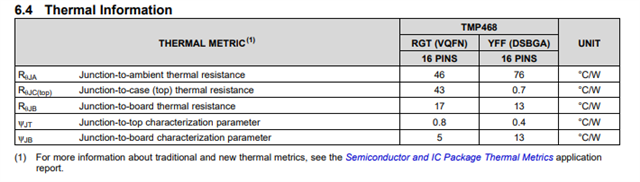 All thermal info related to TMP468 is on page 5 of the datasheet. For more information about traditional and new thermal metrics, see the Semiconductor and IC Package Thermal Metrics (Rev. D) application report.