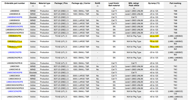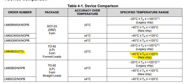 We are trying to order LM60 formed leads option with a temperature range of -40°C to +125°C.