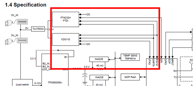 We understand that the architecture of the EVB is as shown in the attached diagram, which includes the XDS110 and FTDI on the 6844 EVB PCB.