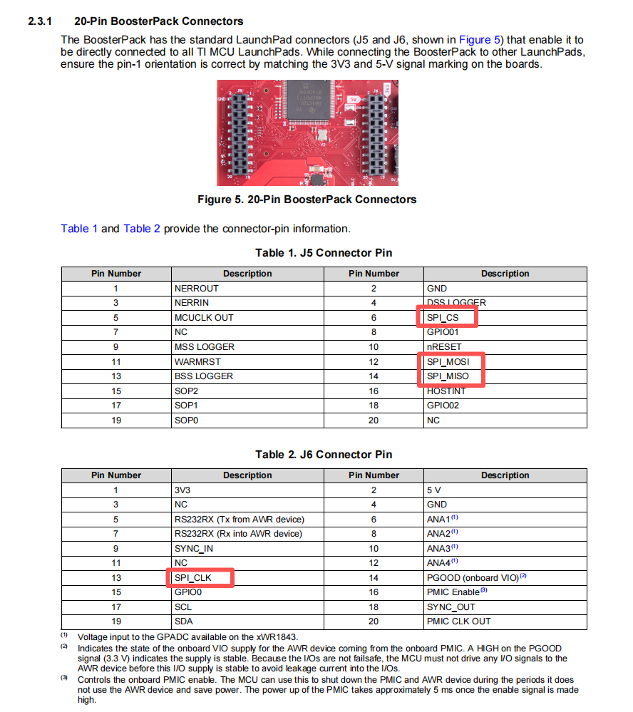 Now, I can output data normally from the UART port using the 1843 OOB firmware. The documentation states that the 1843 has two 20-pin BoosterPack Connectors on the back, which support both 232 and SPI. Now, I want to use this pin to output data from the OOB firmware. Is there any guidance document available, such as wiring instructions or software modification instructions.