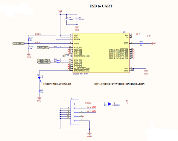 RS232TX, RS232TX of IWR routes to CP2105 and then finally to USB |