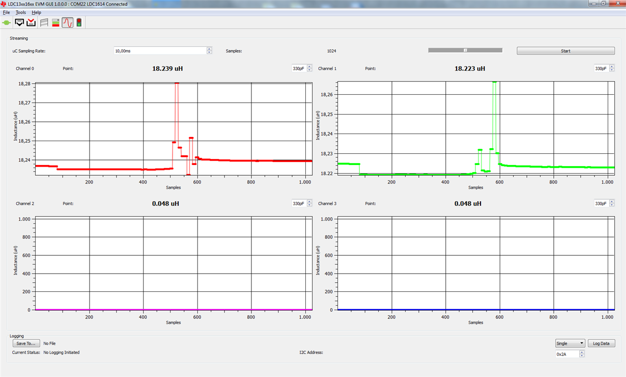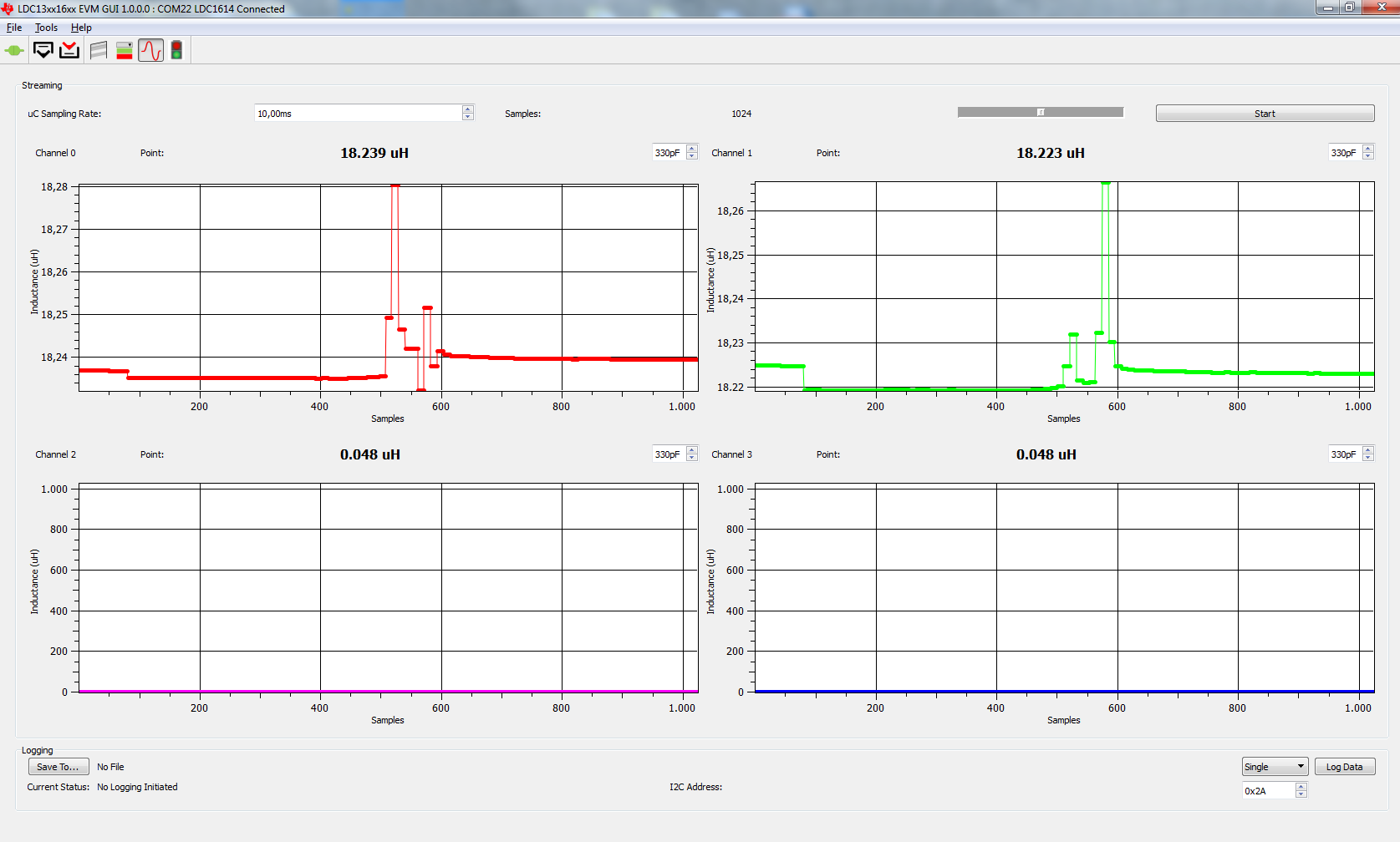 I'm starting up with LDC1614EVM board. I want to use the two sensor coils in the pcb, stick the EVM board on a metal surface and detect the two channel (like a metal keyboard with two buttons). I tried with a 1.5 mm thick aluminum plate and it works (pressed channel decreases inductance value, unpressed channel increases), but with a 0.7 mm metal surface I do not know which parameter to change.