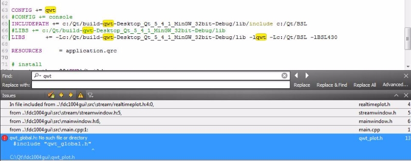 Thakns, it indeed was built outside and I changed the path accordingly. The strange thing is that the gui project wasn't built since qwt_plot.h was not found although I changed the paths. it was not found in realtimeplot.h (from fdc 1004 gui project) so I copied qwt_plot.h to the same location and after that the error was that qwt_global.h is not found, please see below screen shot.