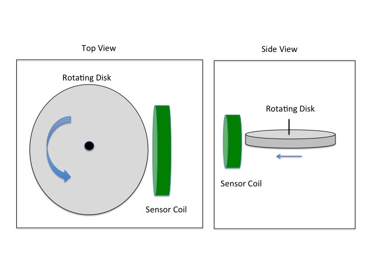 I'd like to know if your inductive sensing technology is capable of sensing the rotational speed of a metal disk when the coil sensor is placed in a perpendicular plane. Please see the diagram below.
