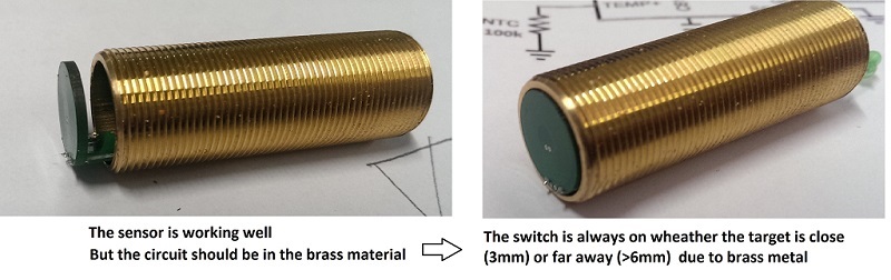 We have to mounted this sensor into the brass metal, but when I put it into brass material the switch is always on (Look at the picture please)