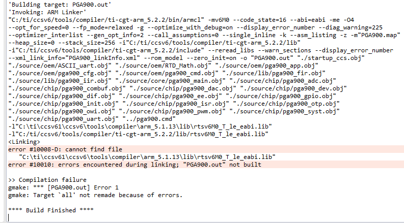 I updated the Runtime support library directory but I still get an error when I try to build the project. It seems like the compiler is still looking in the wrong directory when building the PGA900.out file (see screen snip below). Is there somewhere else I need to update the Library directory?