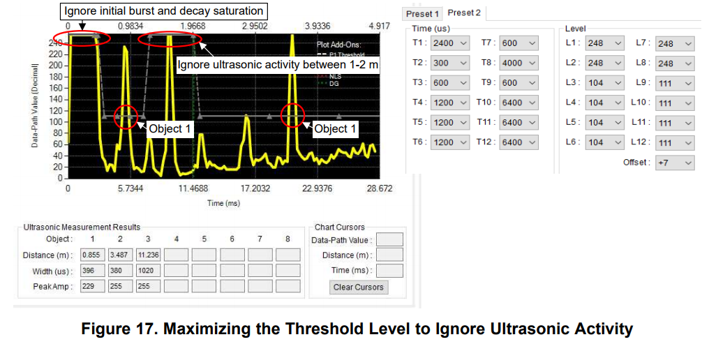 I experience some issues when I try to read the distance information. In fact, all the returned values (8 objects) never update and are not coherent with the analogic signal that I can see on the TEST pin of the PGA460. I already read the FAQ about this case and I changed the value of my threshold but without any success.