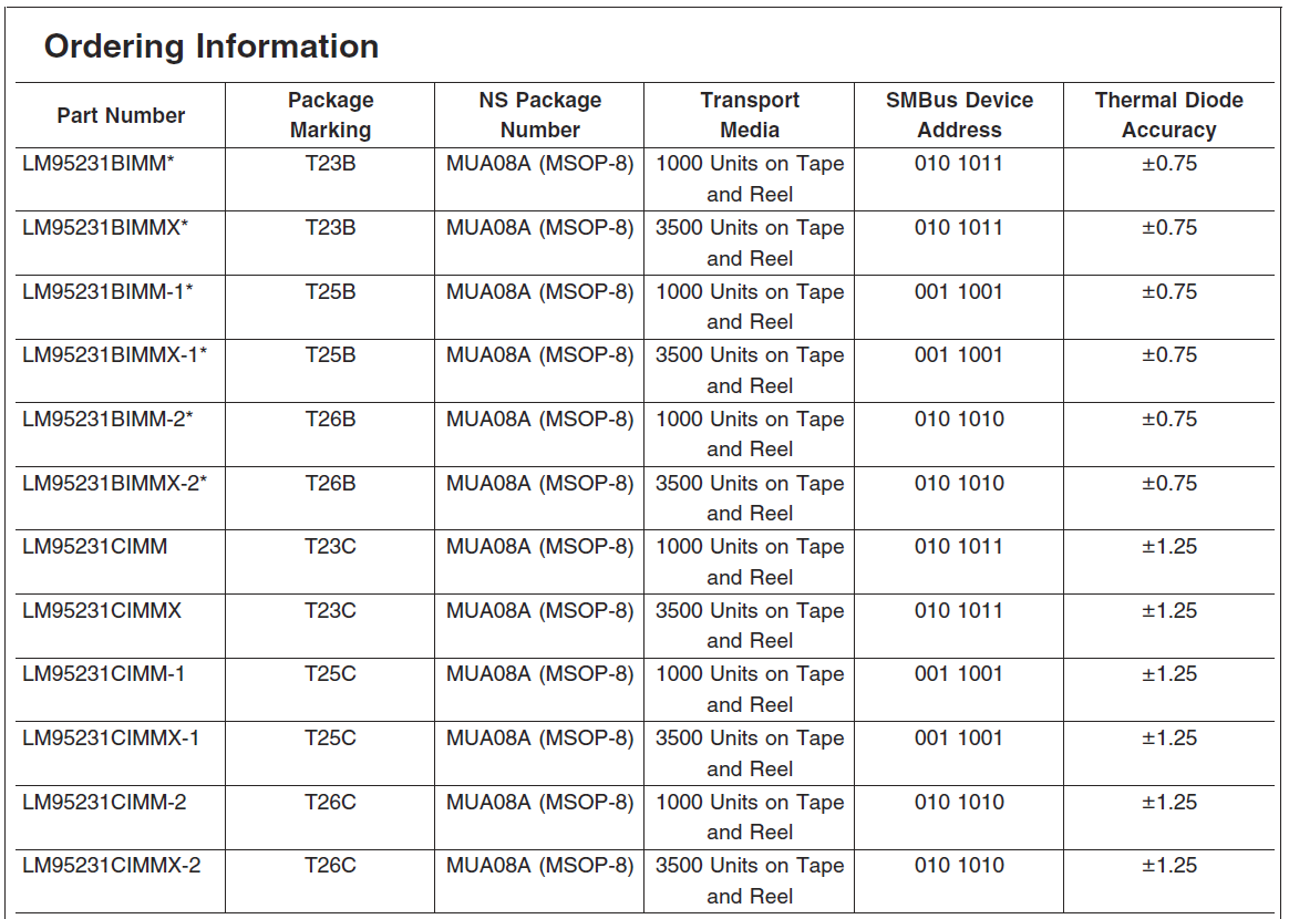 I have bought LM95231CIMM/NOPB and downloaded the data sheet (rev E) from ti.com. In this document it says that the SMBus slave address for my part 1010111, but the address of the device corresponds to the description of the manufacturer National Semiconductor – 0101011. I have checked the marking on the part: 34CE T23C.