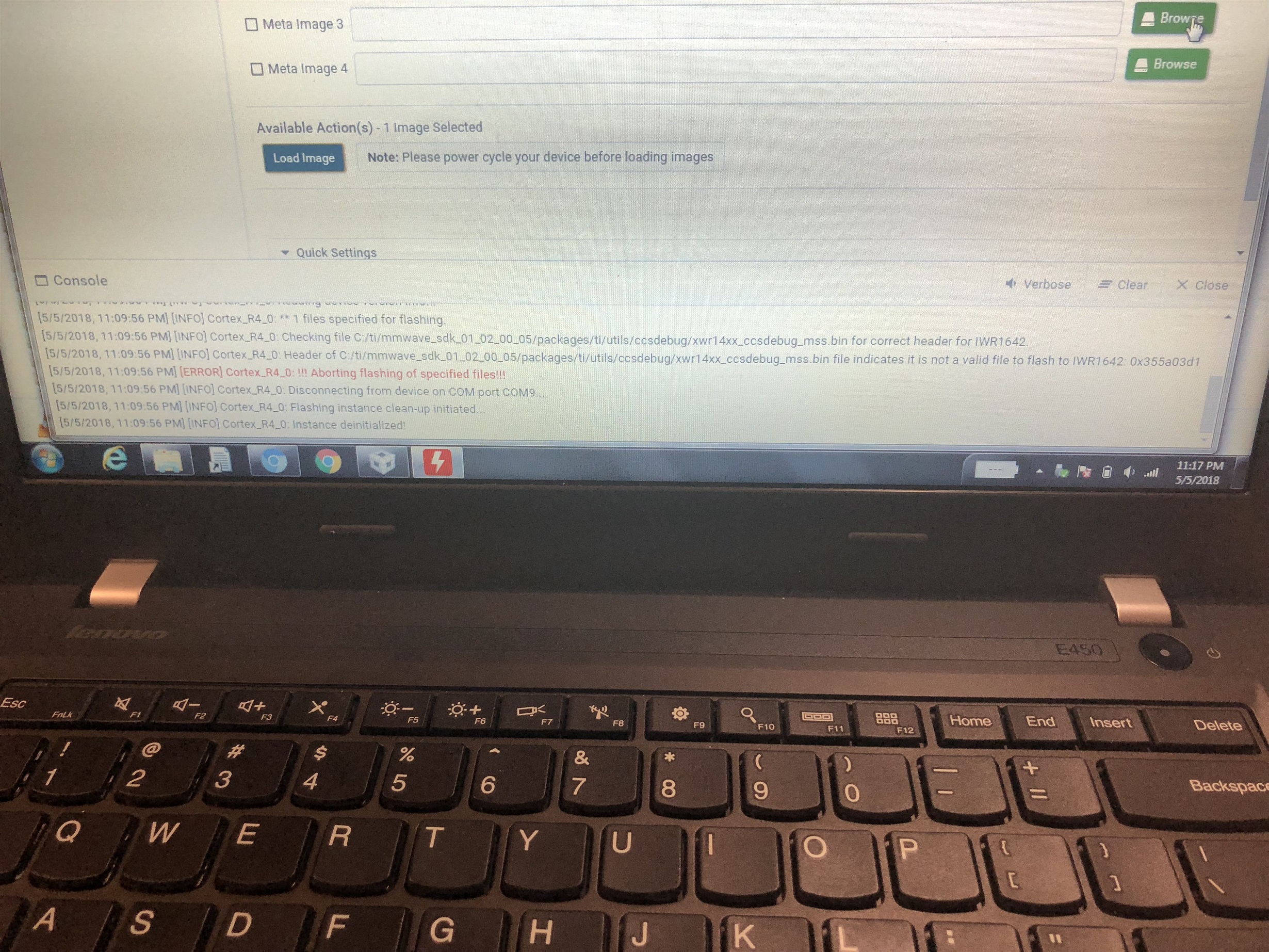 I'm using UniFlash to try and flash two images onto my IWR1642BOOST. The two images were downloaded and installed by the SDK package and I am following this tutorial step by step(currently on pg. 19). When I try to flash the images that it mentions, UniFlash reports error after checking the image headers saying "xxxxx file indicates it is not a valid file to flash to IWR1642", but this is exactly the file that the tutorial had asked me to flash onto the IWR1642? I have made sure the COM port is correct and power cycled the device multiple times. Please help, thanks a lot!