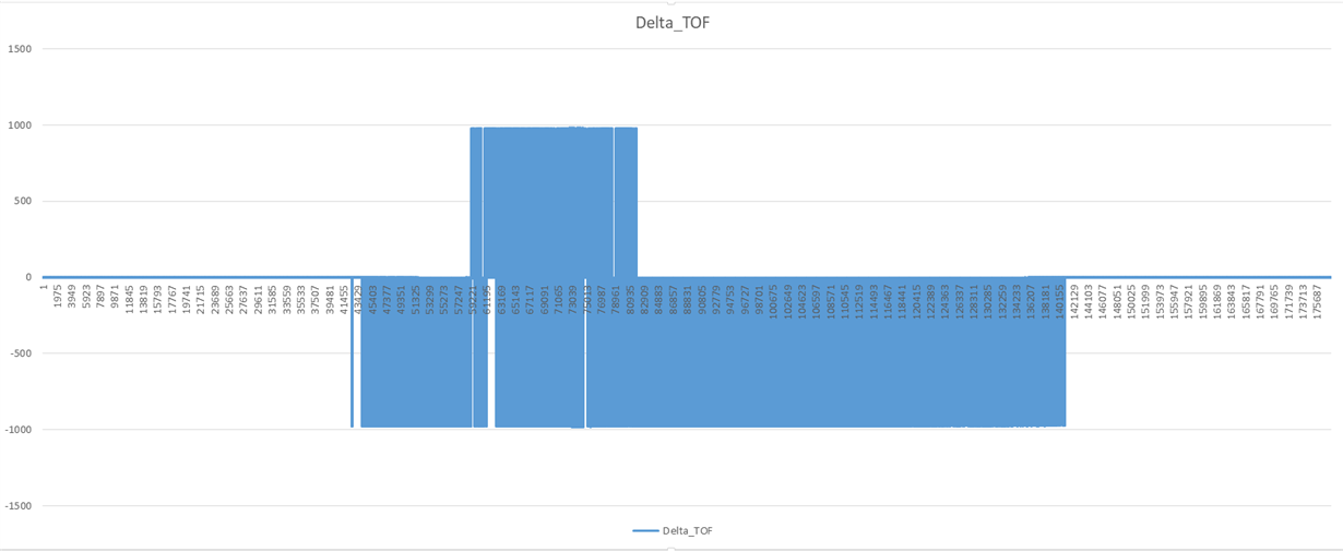 Attached is the zero flow test data which is carried out for over 2 hours. Each reading is taken at 100ms. I was getting an average zero flow reading around 4 ns but this used to shoot upto directly -997 ns and 997 ns and staying there for long time. I think the previously measured STOP signals are being used to measure TOF as upstream and downstream have a 1ms difference between them. Why does this happen sometimes? How can I avoid this behaviour?