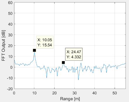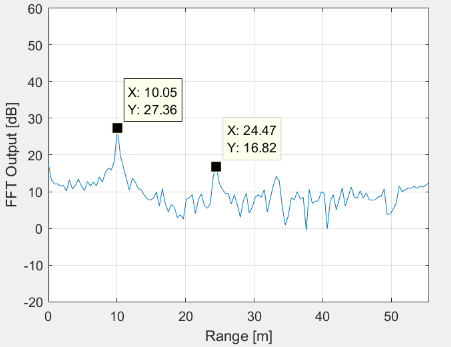 I designed a waveform for up to 50m and took some measurements in ~5m steps from 5 to 50m with an object in boresight. I was using a corner reflector with about 110 m².