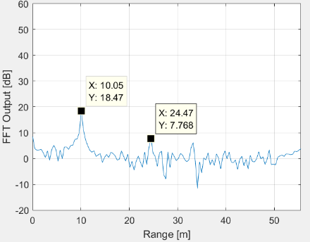 In this plot you can see the mentioned values (sorry for the missing axes labels - x axis: range in m, y axis: power in dB):