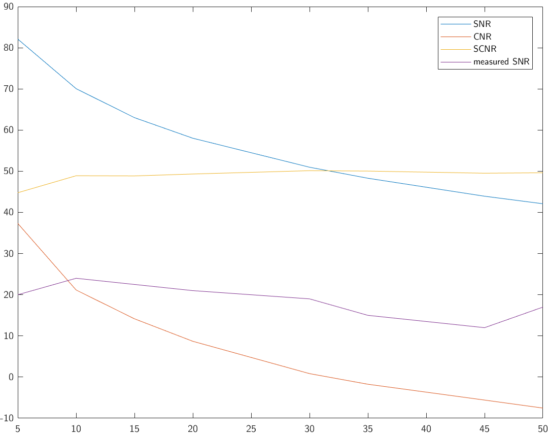So you can see that the "measured SNR" curves matches the SCNR better than the SNR curve (no surprise). But there is also a difference of about ~25 dB.