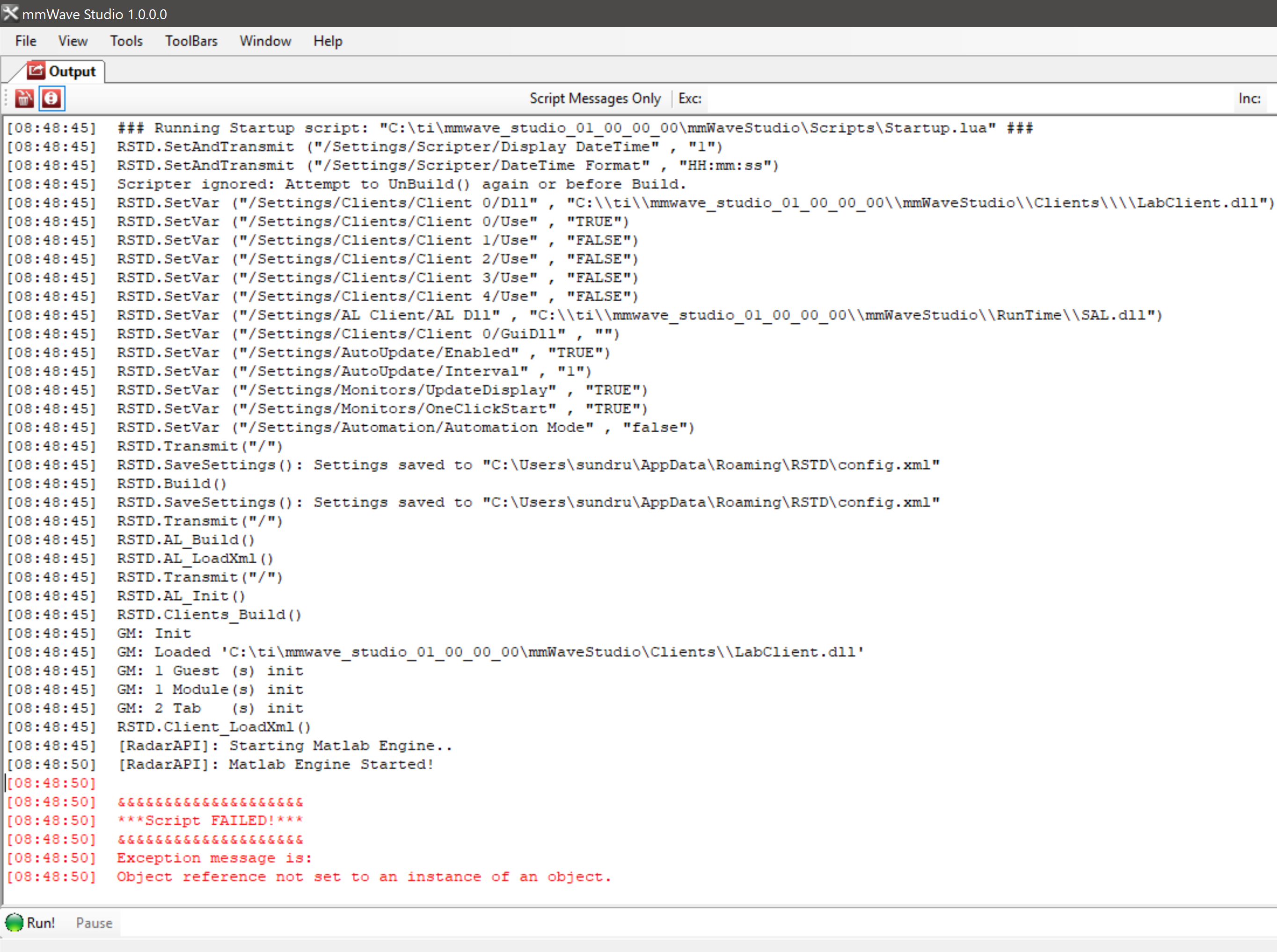 New user here, trying to setup the mmwave studio to connect to IWR1443Boost module and get below error screenshot. Any idea on how can resolved this ? am on a Windows 10 Box.