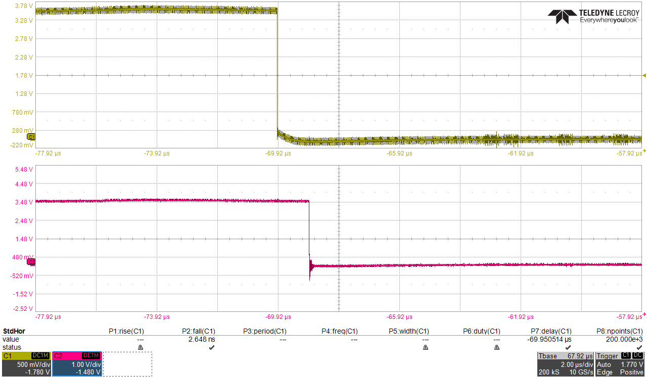 I'm using a TDC7200 to measure the ToF. Up until this moment, I've successfully configured all the registers and I'm able to see the interrupt on INTB pin. The TDC is configured to operate in Mode2 (16MHz external CLOCK), with a single STOP, 2 Calibration cycles at the end and with START, STOP and TRIGG at falling edge. The NEW MEASUREMENT and CLOCK_COUNTER_OVF Interrupts are enabled while the COARSE_COUNTER_OVF is disabled in INT_MASK. I've set the CLOCK_CNTR_OVF to several different values and the interrupt instant on INTB responds accordingly. For e.g., in the images below, I've set the overflow condition to 1us and 4us and one can see the INTB pin (Red signal) switching at the right time after the falling edge on START (yellow). I've also verified the INT_STATUS register after each interrupt and I obtain 0x1D (Clock overflow detected). The problem I'm facing is reading the CLOCK_COUNT1 registers. In principle, I should read the same value set on the CLOCK_CNTR_OVF. Whatsoever, I'm always reading 0.