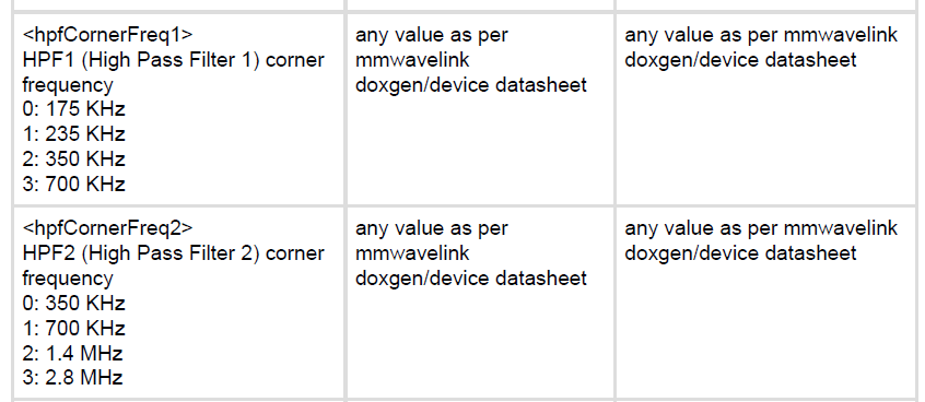 Bottom Line Up Front: Does the HPF1 from the mmWave SDK modify the first filter's high-pass corner frequency in the receiver subsystem image and does the HPF2 from the mmWave SDK modify the second filter's low-pass corner frequency in the receiver subsystem image?