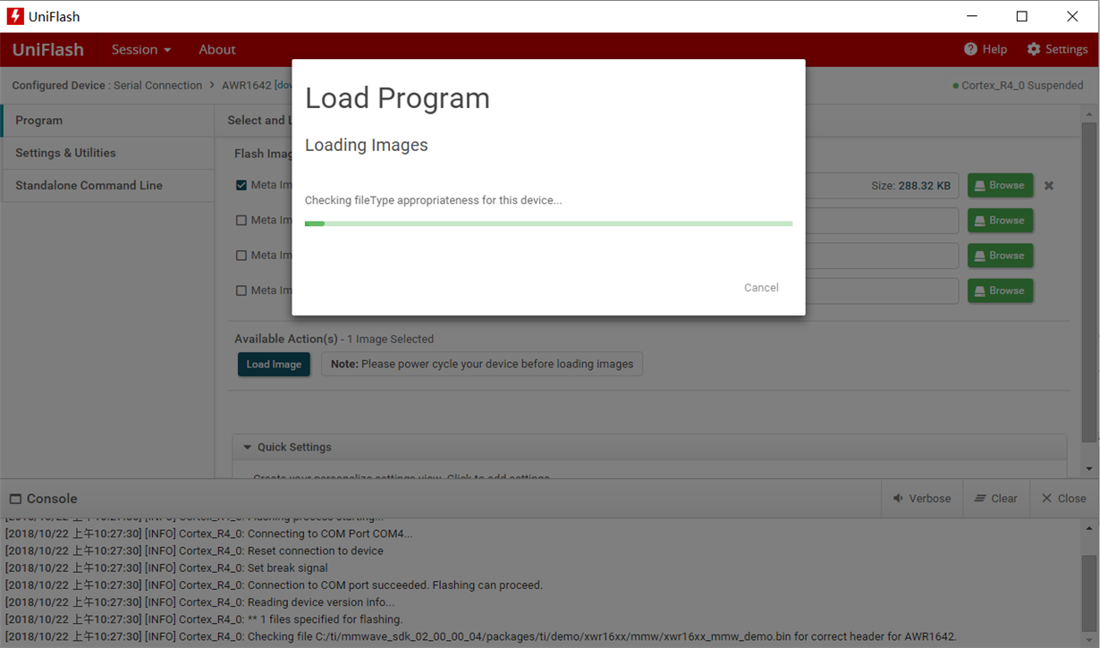 I`ve waited for a long long time but it cannot continue to flash xxwr16xx_mmw_demo.bin into AWR1642.