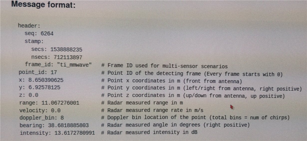 Currently we are using a ROS package, it provide a /RScan message topic. That message structure format is attached with this post. Is there any provision or ROS package to obtain tracked obstacle list from the RADAR. Any information will be helpful.