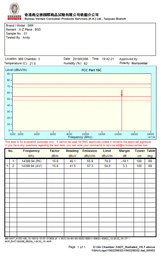 We found there are 2 spurious over the NCC (Taiwan radio regulation standard) requirement. The spurious emission are 14.4GHz and 28.8GHz (please see attach 2 pictures) both failing the average standard of 54.0 dBuV/m for about 3~6 dB.