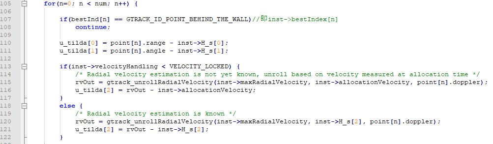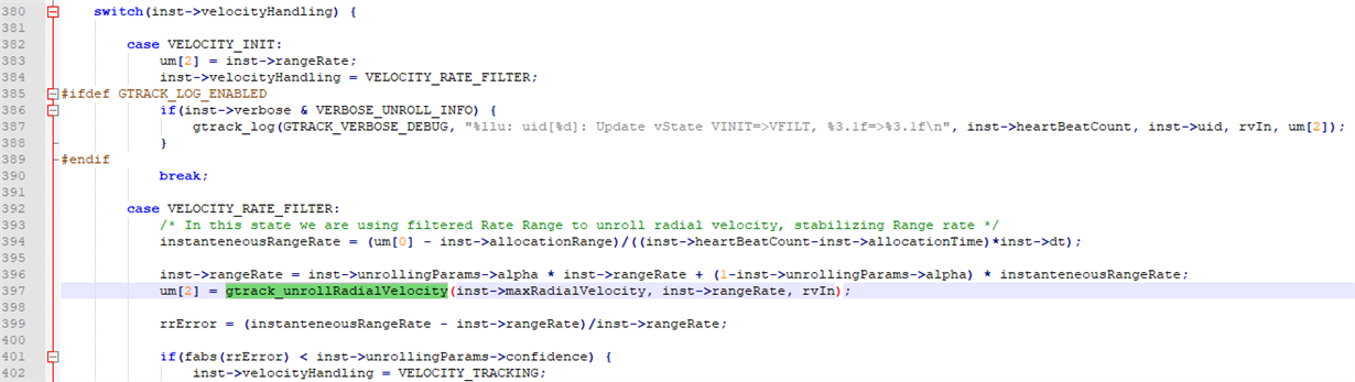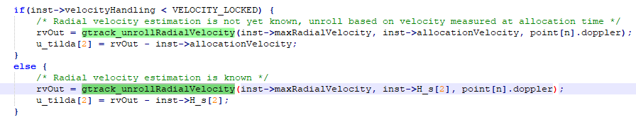I am learning the code about GTRACK Algorithm.In the The imlementation of gtrack_moduleAssociate function, gtrack_unrollRadialVelocity is used to unroll radial velocity from +/- rvMax form based on expectation velocity value.I feel confused why we need to do that.And in the declaration of gtrack_unrollRadialVelocity function,when rvExp is larger than rvIn,we do 'rvExp+rvMax'?