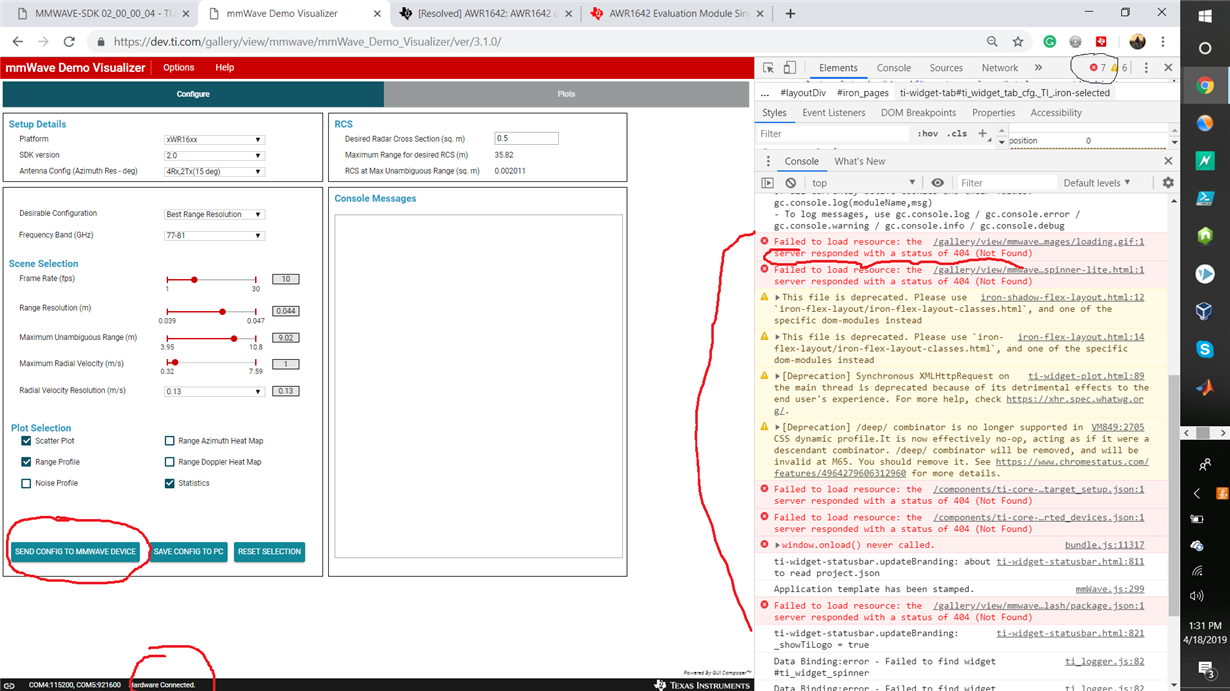 Running the pplcount takes forever that's why you haven't post the screenshot yet. I reduced my issue around the serial port and have put my energy toward trying to run simply the mmWave Visualizer and this bellow is where I get stuck. It shows connected to the hardware and there's nothing else that happens. I just inspected to see webpage connection and this is what I see. I don't think it's much connected at all but hopefully you guys can clear this up.