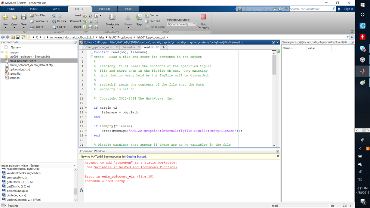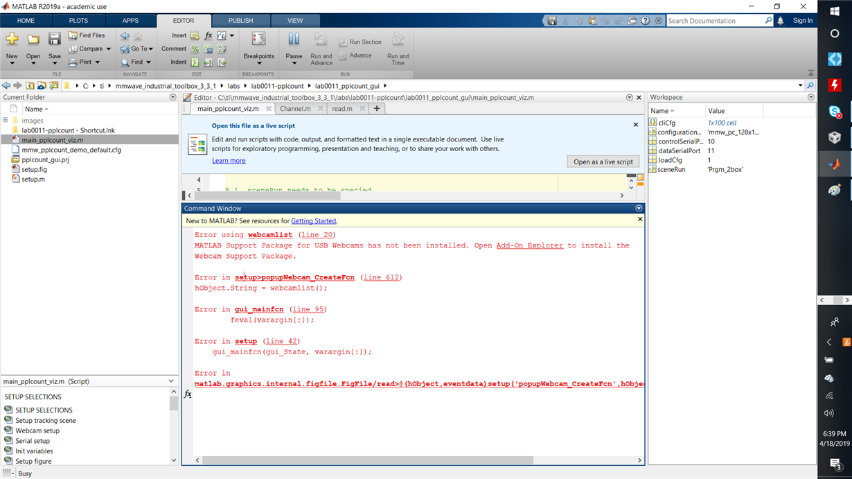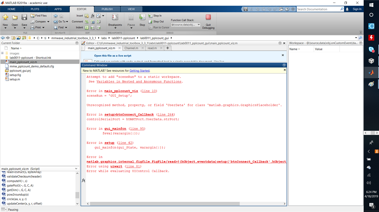 Q2-Yes. You can run almost everything from that project PPlcount project, but it fails at the Matlab GUI. So far I debuted it by insuring the 2017a Matlab runtime was working on my computer, I have installed some of the dependency files. I even tried bypassing that GUI using just the option: SceneRun = "Prgm_2box' to programmatically setup the scene and that ran with a Serial warning before stoping because there was no data in the reading buffer.