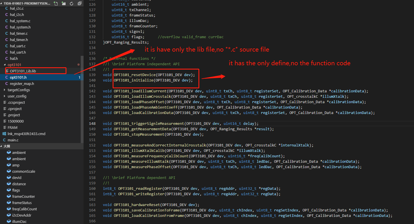 the file is only contain the header file(*.h) and the lib file(OPT3101_Lib.lib),I can't get the source file.