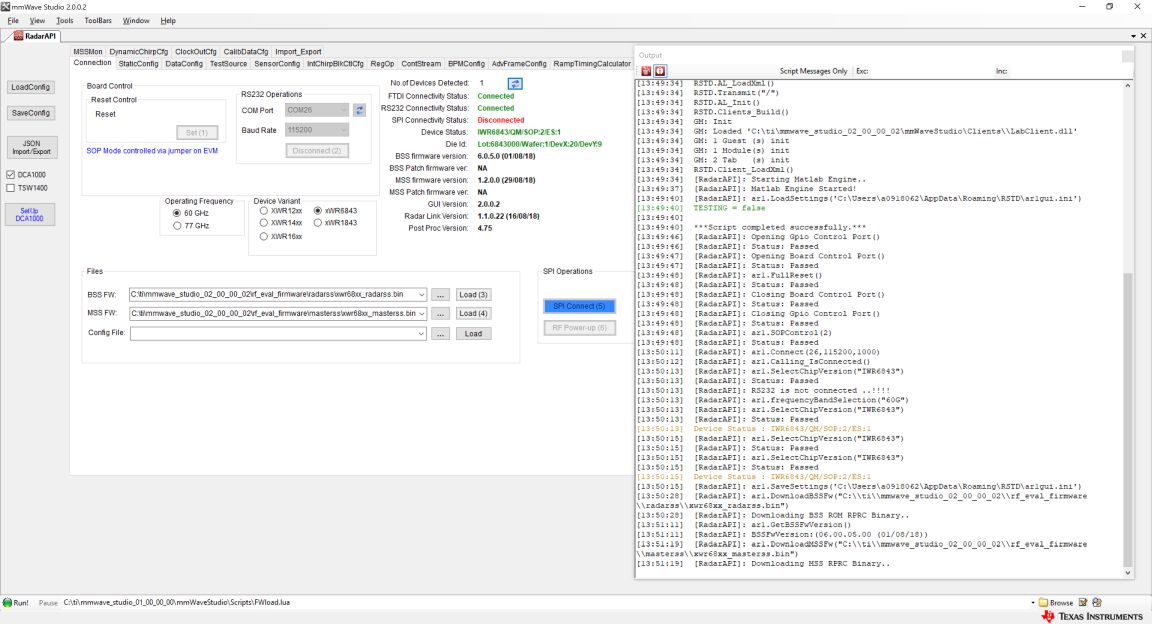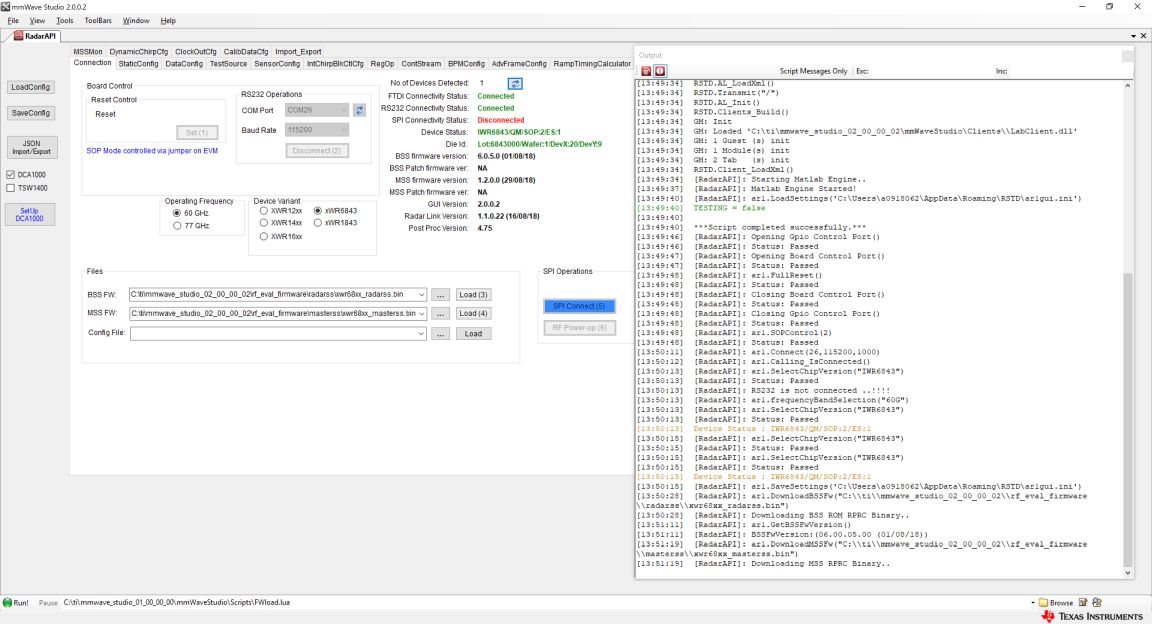 GM: Constructor GM: Tue Jun 04 16:49:31 2019 RSTD.Transmit("/Settings") [16:49:31] [16:49:31] ### Running Startup script: "C:\ti\mmwave_studio_02_00_00_02\mmWaveStudio\Scripts\Startup.lua" ### [16:49:31] RSTD.SetAndTransmit ("/Settings/Scripter/Display DateTime" , "1") [16:49:31] RSTD.SetAndTransmit ("/Settings/Scripter/DateTime Format" , "HH:mm:ss") [16:49:31] Scripter ignored: Attempt to UnBuild() again or before Build. [16:49:31] RSTD.SetVar ("/Settings/Clients/Client 0/Dll" , "C:\\ti\\mmwave_studio_02_00_00_02\\mmWaveStudio\\Clients\\\\LabClient.dll") [16:49:31] RSTD.SetVar ("/Settings/Clients/Client 0/Use" , "TRUE") [16:49:31] RSTD.SetVar ("/Settings/Clients/Client 1/Use" , "FALSE") [16:49:31] RSTD.SetVar ("/Settings/Clients/Client 2/Use" , "FALSE") [16:49:31] RSTD.SetVar ("/Settings/Clients/Client 3/Use" , "FALSE") [16:49:31] RSTD.SetVar ("/Settings/Clients/Client 4/Use" , "FALSE") [16:49:31] RSTD.SetVar ("/Settings/AL Client/AL Dll" , "C:\\ti\\mmwave_studio_02_00_00_02\\mmWaveStudio\\RunTime\\SAL.dll") [16:49:31] RSTD.SetVar ("/Settings/Clients/Client 0/GuiDll" , "") [16:49:31] RSTD.SetVar ("/Settings/AutoUpdate/Enabled" , "TRUE") [16:49:31] RSTD.SetVar ("/Settings/AutoUpdate/Interval" , "1") [16:49:31] RSTD.SetVar ("/Settings/Monitors/UpdateDisplay" , "TRUE") [16:49:31] RSTD.SetVar ("/Settings/Monitors/OneClickStart" , "TRUE") [16:49:31] RSTD.SetVar ("/Settings/Automation/Automation Mode" , "false") [16:49:31] RSTD.Transmit("/") [16:49:31] RSTD.SaveSettings(): Settings saved to "C:\Users\a0918062\AppData\Roaming\RSTD\config.xml" [16:49:31] RSTD.Build() [16:49:31] RSTD.SaveSettings(): Settings saved to "C:\Users\a0918062\AppData\Roaming\RSTD\config.xml" [16:49:31] RSTD.Transmit("/") [16:49:31] RSTD.AL_Build() [16:49:31] RSTD.AL_LoadXml() [16:49:31] RSTD.Transmit("/") [16:49:31] RSTD.AL_Init() [16:49:31] RSTD.Clients_Build() [16:49:31] GM: Init [16:49:31] GM: Loaded 'C:\ti\mmwave_studio_02_00_00_02\mmWaveStudio\Clients\\LabClient.dll' [16:49:31] GM: 1 Guest (s) init [16:49:31] GM: 1 Module(s) init [16:49:31] GM: 2 Tab (s) init [16:49:31] RSTD.Client_LoadXml() [16:49:31] [RadarAPI]: Starting Matlab Engine.. [16:49:36] [RadarAPI]: Matlab Engine Started! [16:49:39] [RadarAPI]: ar1.LoadSettings('C:\Users\a0918062\AppData\Roaming\RSTD\ar1gui.ini') [16:49:39] TESTING = false [16:49:39] [16:49:39] ***Script completed successfully.*** [16:49:44] [RadarAPI]: Opening Gpio Control Port() [16:49:44] [RadarAPI]: Status: Passed [16:49:44] [RadarAPI]: Opening Board Control Port() [16:49:44] [RadarAPI]: Status: Passed [16:49:45] [RadarAPI]: ar1.FullReset() [16:49:45] [RadarAPI]: Status: Passed [16:49:46] [RadarAPI]: Closing Board Control Port() [16:49:46] [RadarAPI]: Status: Passed [16:49:46] [RadarAPI]: Closing Gpio Control Port() [16:49:46] [RadarAPI]: Status: Passed [16:49:46] [RadarAPI]: ar1.SOPControl(2) [16:49:46] [RadarAPI]: Status: Passed [16:49:50] [RadarAPI]: ar1.Connect(7,115200,1000) [16:49:52] [RadarAPI]: Error: Connection failed: Calling_ConnectTarget returned 3 [16:49:52] [RadarAPI]: ar1.Calling_IsConnected() [16:49:52] [RadarAPI]: ar1.SaveSettings('C:\Users\a0918062\AppData\Roaming\RSTD\ar1gui.ini')