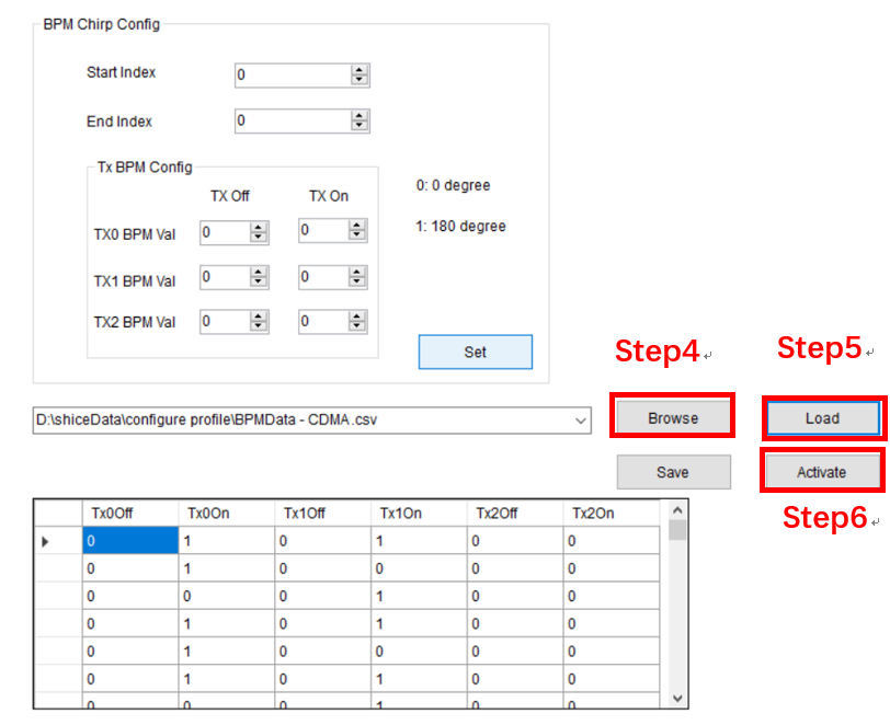 The CSV feature in the BPM chirp config tab (Step 4, 5, 6 in your figure above) is not working in this version; it will be fixed in a later version of mmWave Studio.