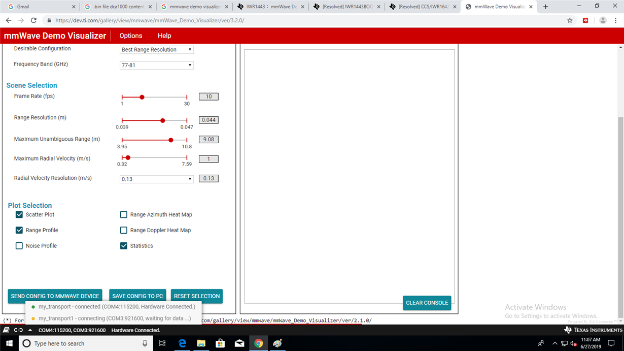 I selected my platform as xwr16xx and sdk as 3.2 which was installed already. The TI cloud tools are also installed already. I clicked send config to mmwave device. Now its saying hardware connected but no plots in the plot section which is blank.