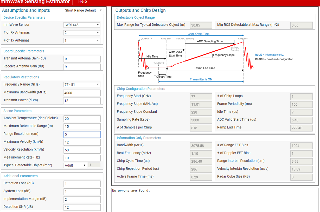 We're trying to find an optimal configuration for a level sensing application at a max distance of around 15 meters. Were trying to use the mmWaveSensingEstimator to generate a chirp design. Unfortunately the design generated with the estimator is not accepted by the device (an error is thrown). As we're trying to detect static objects I've set the max velocity to 12 and velocity resolution to 50. The resulting configuration is not accepted. I've also tried to load the configuration that is used in the level sensing demo of the high accuracy lab (profile_2db.txt), this one also throws an error.