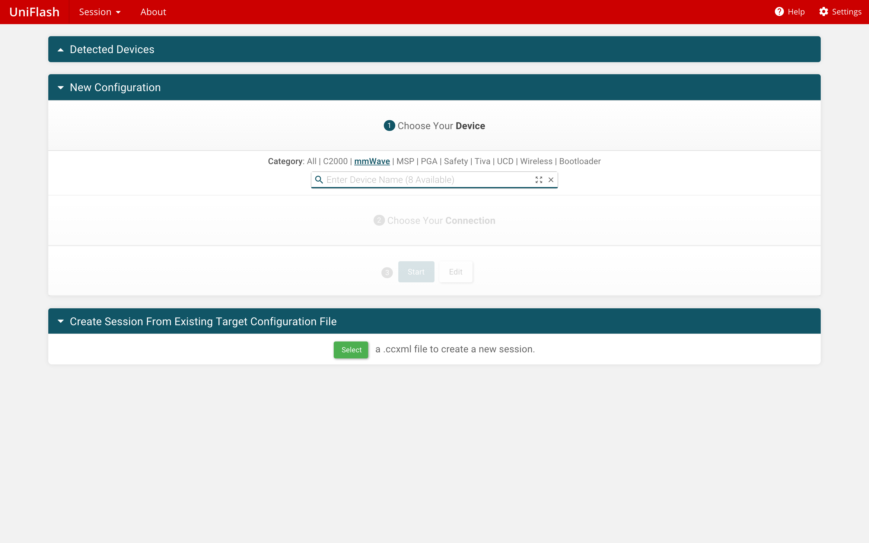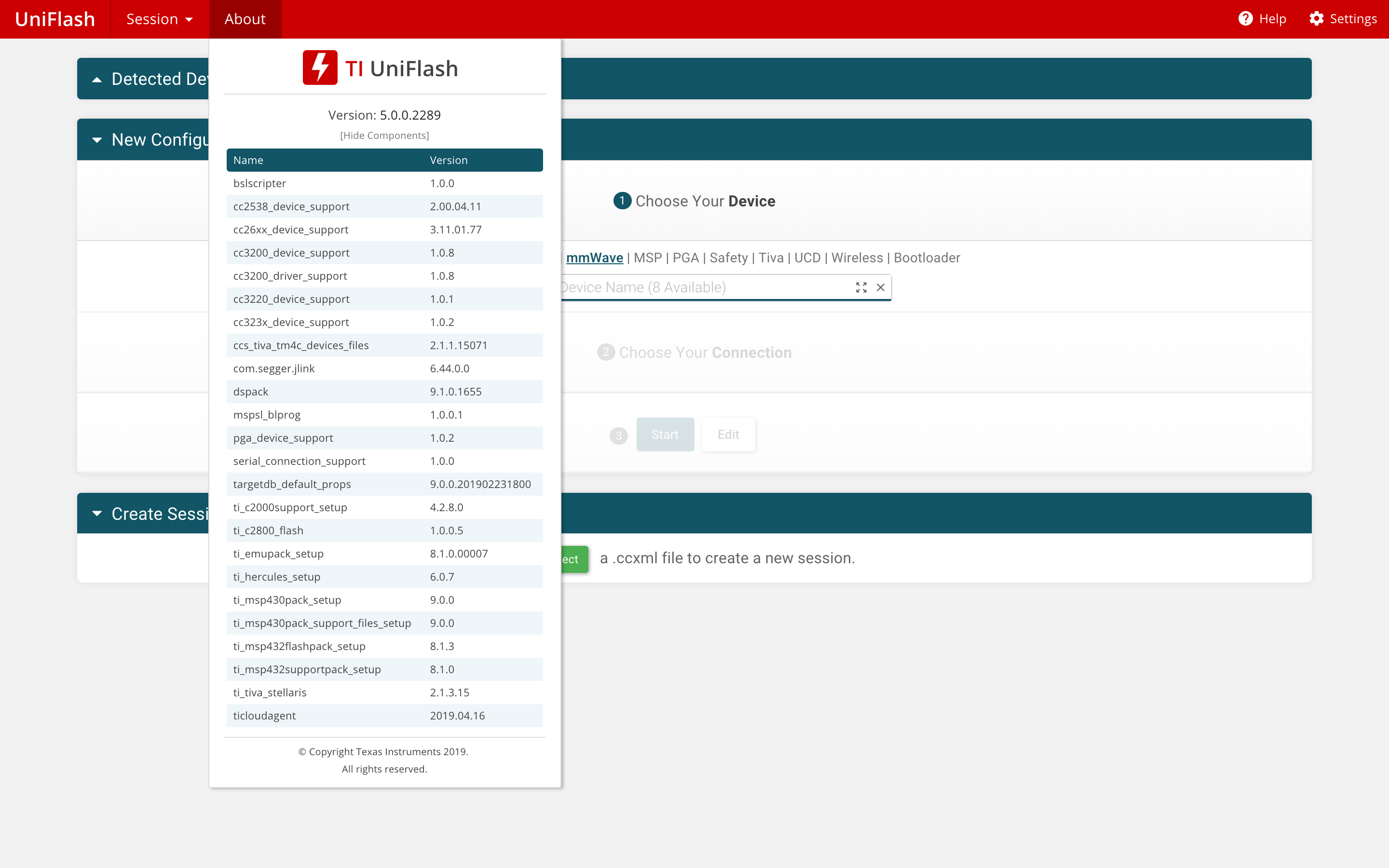 I'm having problem with UniFlash 5.0 version for Mac. It can't auto detect IWR6843ISK-ODS, nor can I select this device in the manually select session. Actually, I can't find any MmWave device in the About menu's show components page. Also, I couldn't find any device listed in the 'Choose Your Device' list if I set the category as 'mmWave' although it says "8 Available". Situations are pretty much the same in the cloud version of UniFlash.