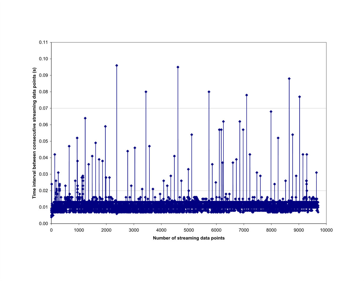 I have successfully done my Labview program to fully control FDC2214 EVM. I found that time interval between two consecutive streaming data points has some spikes. The attached chart shows the result, which was obtained using only channels 0 and 1, stream reading lasted for 105 seconds after stream start and 9700 streaming data logs were recorded in a spreadsheet, average 92 streaming samples per second, which included about 5 repeating value numbers for each data with a new value.