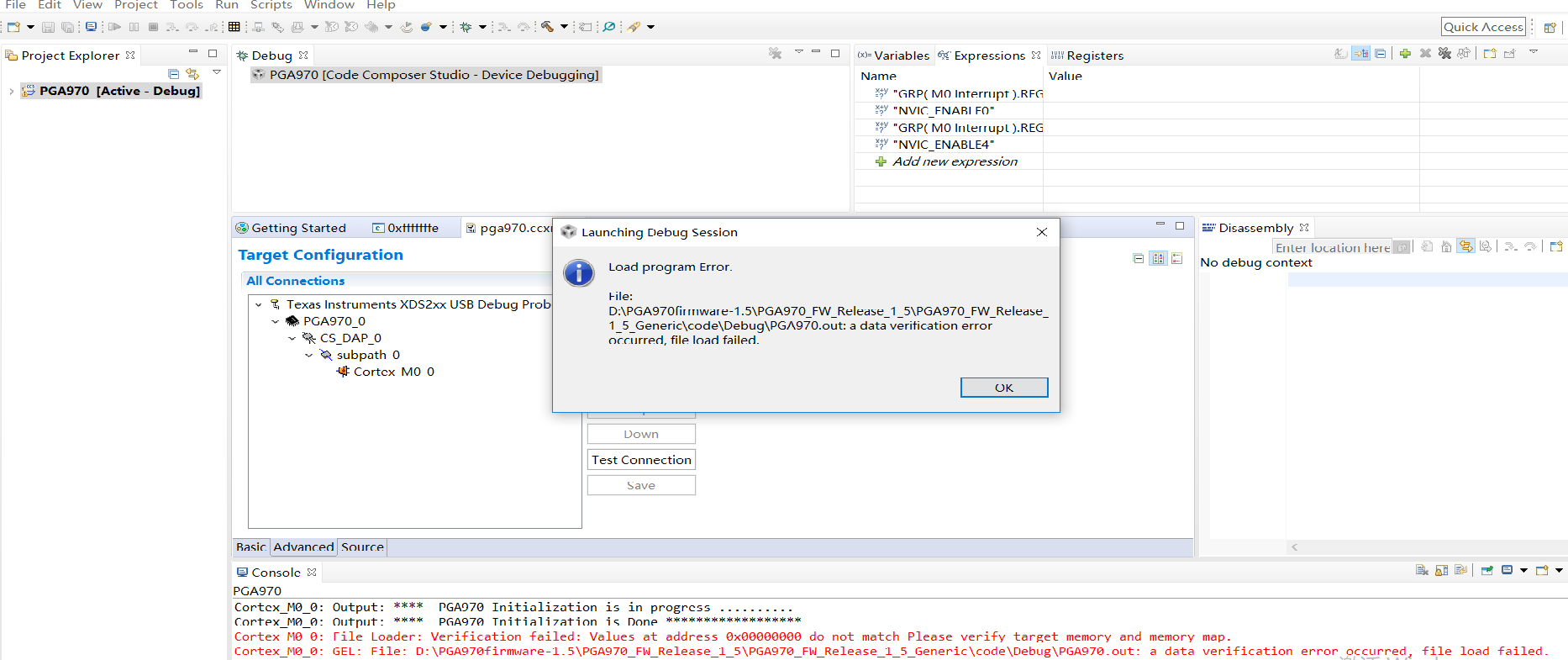 when I turn on the "COMBUF_TESTING" switch, and add some code about SPI_ENABLE(DIG_IF_CTRL |=1; MICRO_INTERFACE_CONTROL|=1;), then I compile the project, debug the project succesfully.But when I exit the debug and enter the debug secondly, I can't do it anymore.