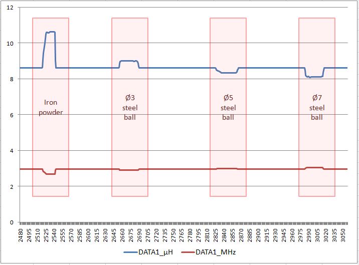 In case of iron powder and Ø3 steel ball, inductance is increase and Ø5, Ø7 steel ball makes inductance decrease.