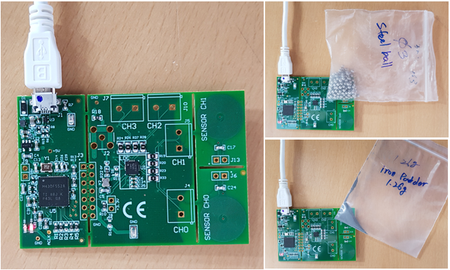 Waveform when iron powder, steel ball(Ø3, Ø5, Ø7) are attached